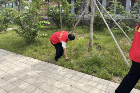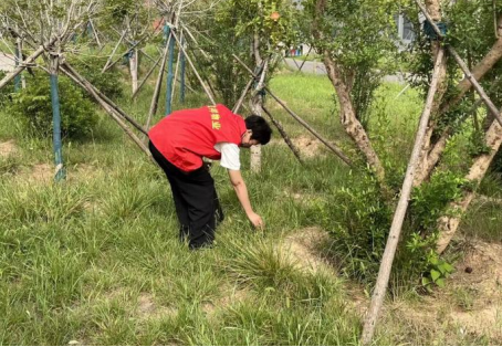 夏季的校园繁花似锦、绿意盎然,一些垃圾藏匿在草丛中不易发现,树枝肆意生长错乱不齐。清理垃圾、修剪枝叶、拔出杂草,虽然花池清理难度增加,但全过程有条不紊,井然有序。
