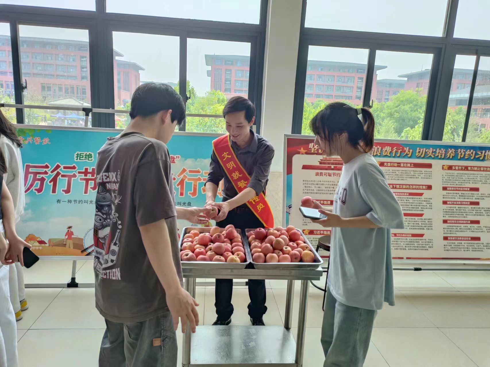 为鼓励全校师生将“光盘行动”常态化,各餐厅在活动期间发放“光盘行动”集点卡,在同一餐厅光盘三次可兑换该餐厅打折卡一张并赠送水果一个。