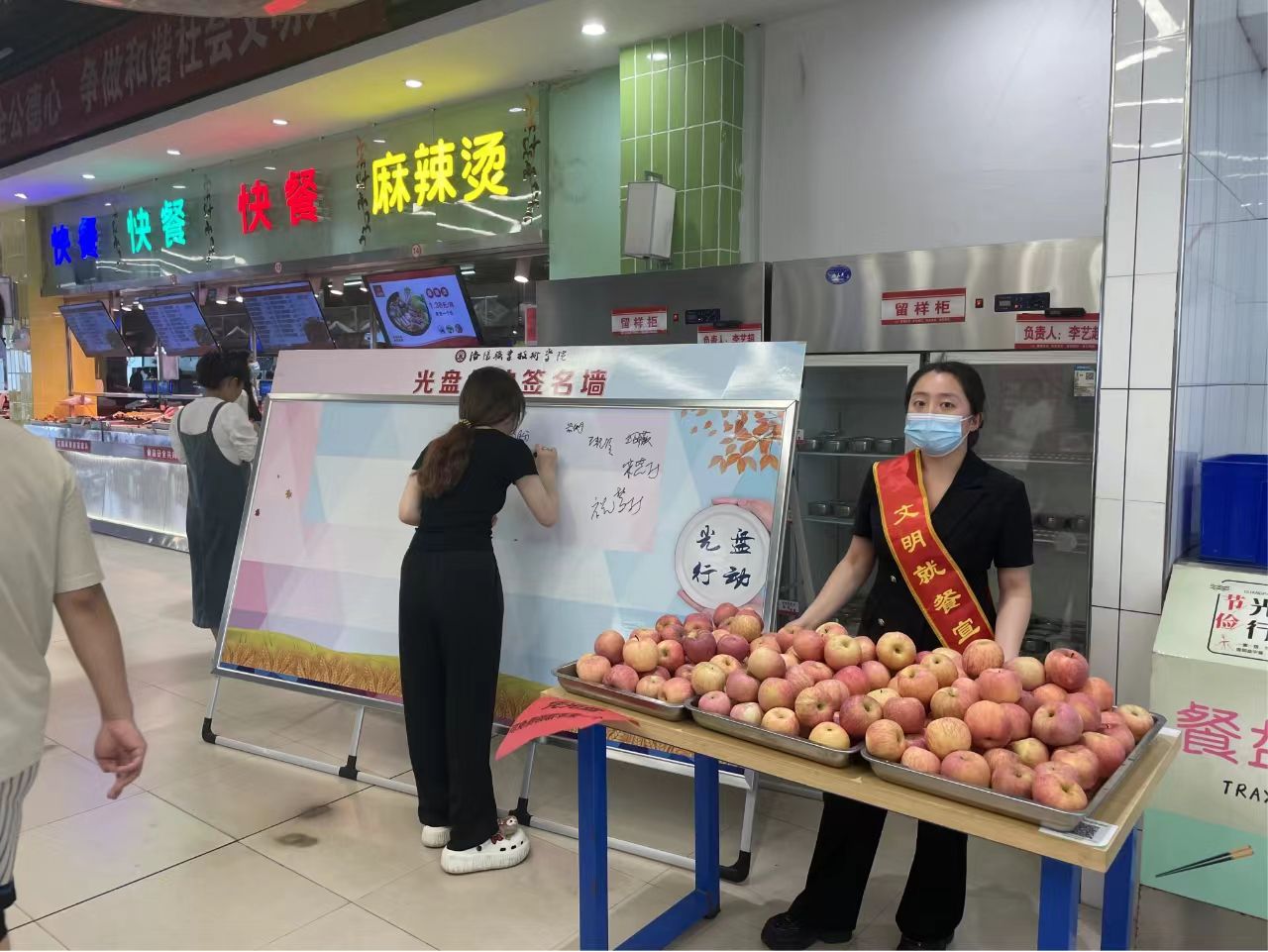 活动期间,我校积极营造文明就餐的浓厚氛围,各餐饮公司、商业街在就餐场所入口处及醒目位置设置节约粮食、反对浪费的告示牌及宣传标语。同时,各餐饮公司加强对从业人员文明用餐引导工作的培训,提高服务人员文明素养和服务水平,并在餐盘回收处设置文明就餐宣传员,适当制止餐饮浪费的行为。