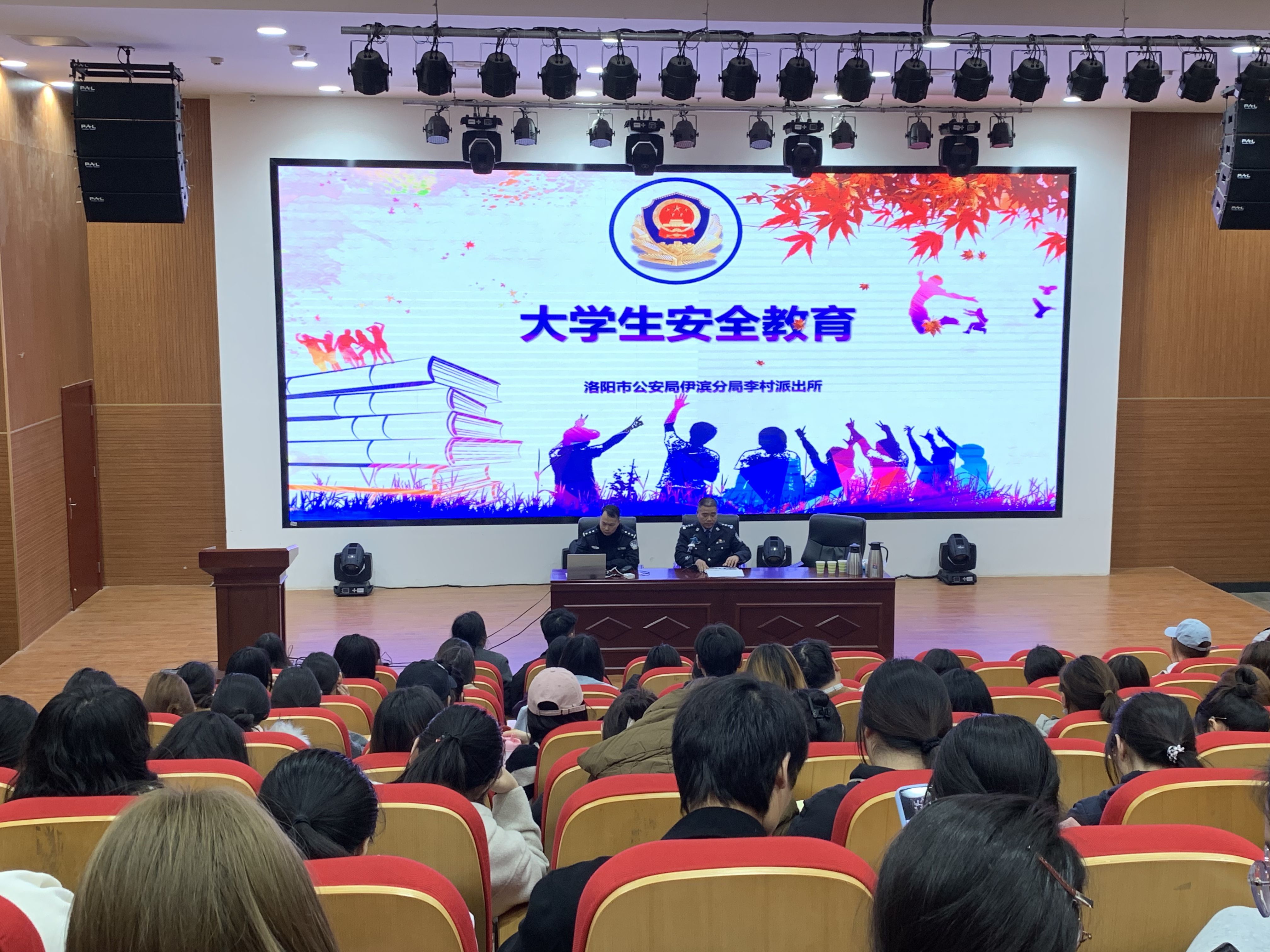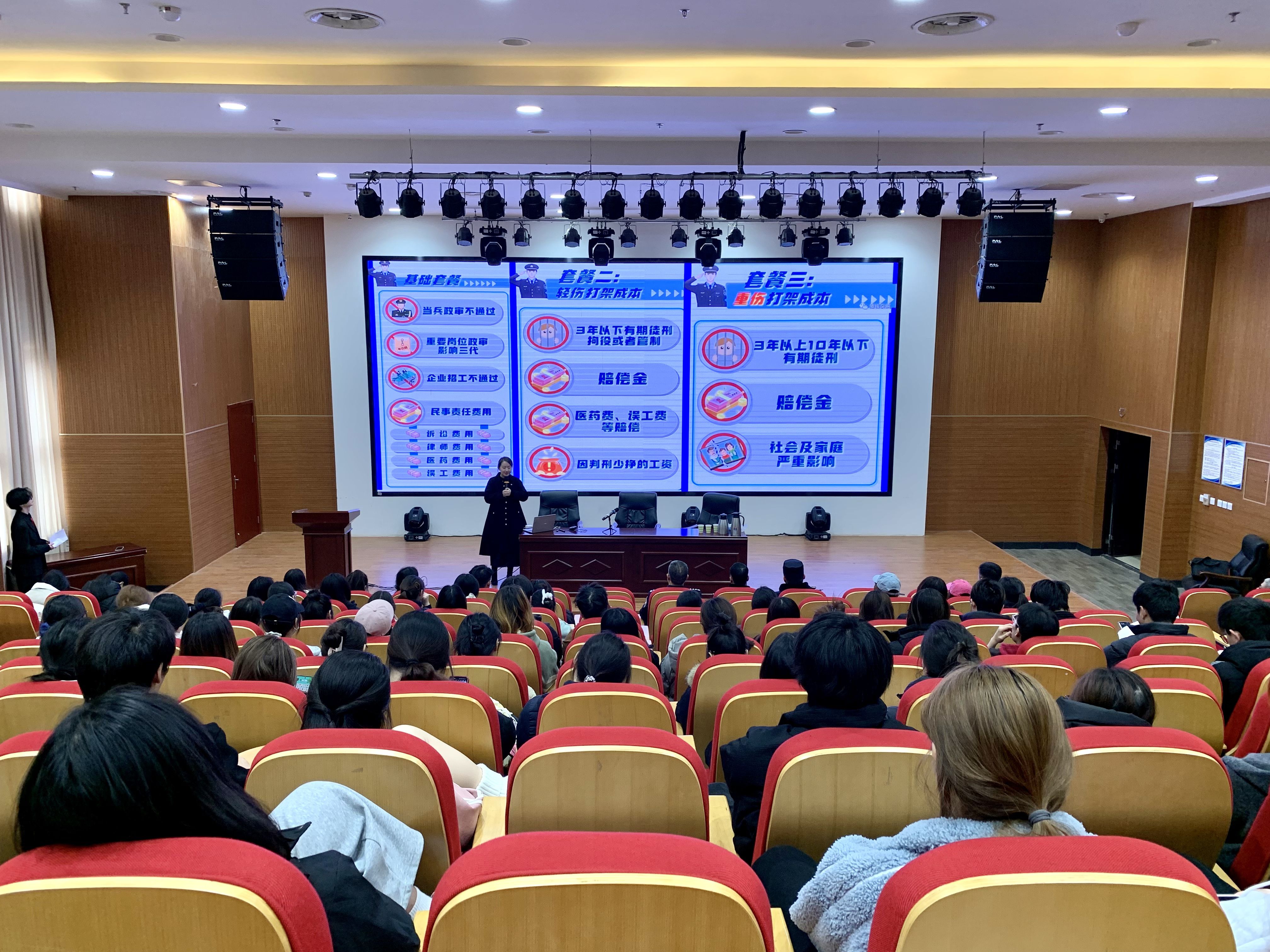 为进一步增强学校师生的法治意识,营造尊法、学法、守法、用法的校园氛围,2月27日,由学生中心与后勤保卫处联合主办的“法治宣传进校园”专题讲座在大学生二楼心理剧场成功举行。本次讲座特邀担任河南先为律师事务所团支部书记、专职律师,洛阳市青年人才,洛阳市法学会理事李亚苏和洛阳市伊滨公安分局原国保大队大队长周文斌为主讲嘉宾,吸引了全校近200名师生积极参与。