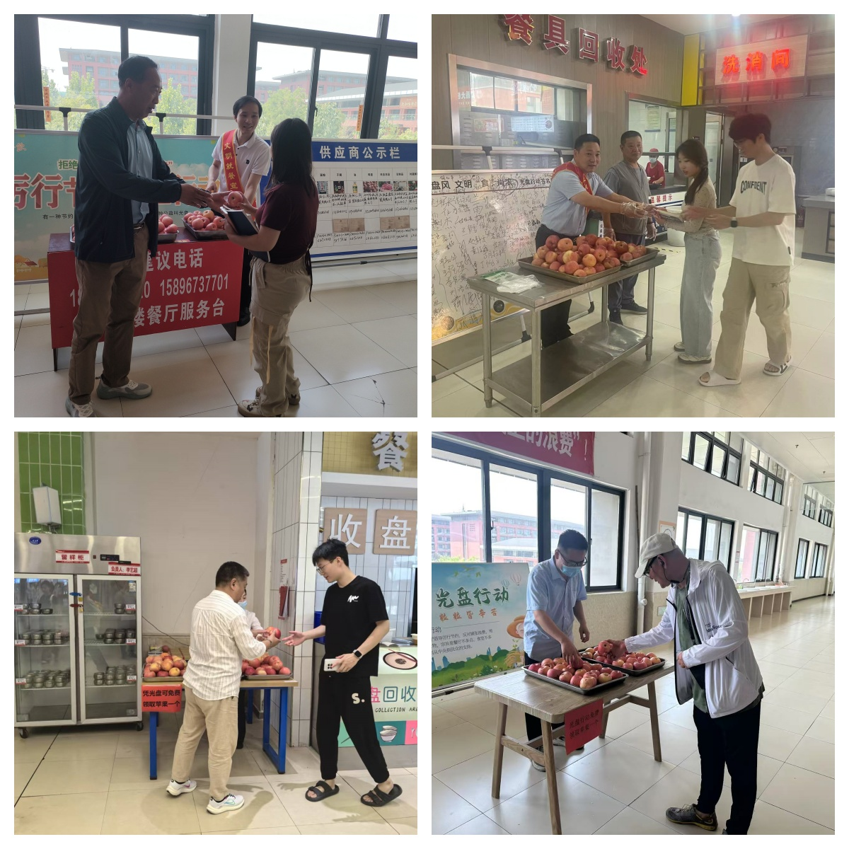 在“光盘行动”打卡环节,二号餐厅北门处、一号餐厅南门处设置了“光盘行动承诺板”,师生们纷纷在承诺板上郑重写下“勤俭节约 光盘行动 从我做起”的承诺,并踊跃参与现场组织的签名活动。为鼓励“光盘行动”常态化,各餐厅在活动期间发放“光盘行动”集点卡,师生在同一餐厅光盘三次即可兑换该餐厅打折卡一张,极大地激发了大家参与的积极性。同时,“光盘行动”送水果活动也受到了师生们的热烈欢迎。活动期间,四家餐厅分别在不同日期开展此项活动,就餐时间在本餐厅光盘的师生可在餐盘回收处领取苹果一个,现场秩序井然,师生们用实际行动践行着光盘理念。